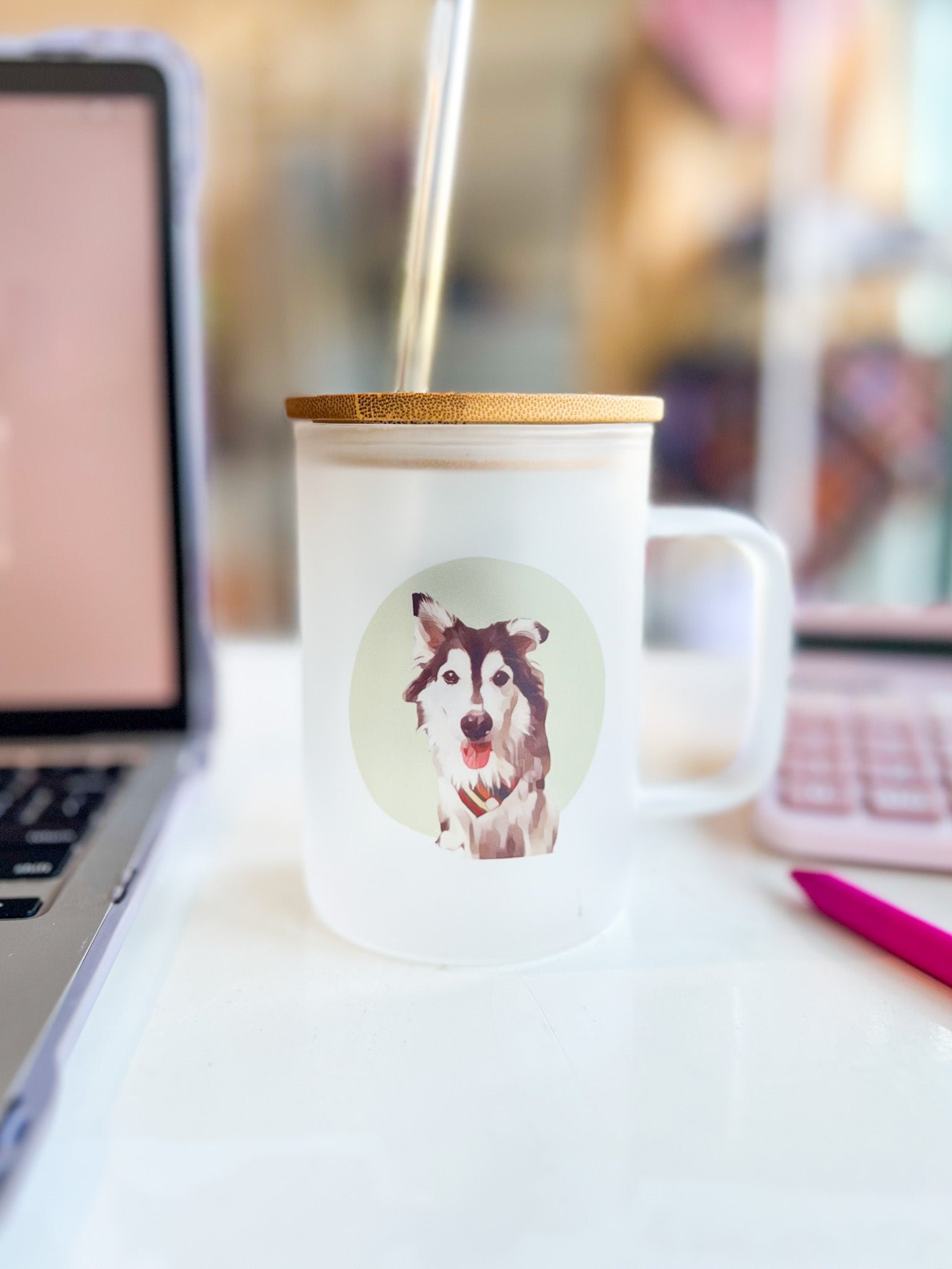16oz frosted glass tumbler that is perfect for your hot coffee or preferred drink! Limit of one pet for this style. Includes bamboo lid and a straw - the type of straw you receive may vary.