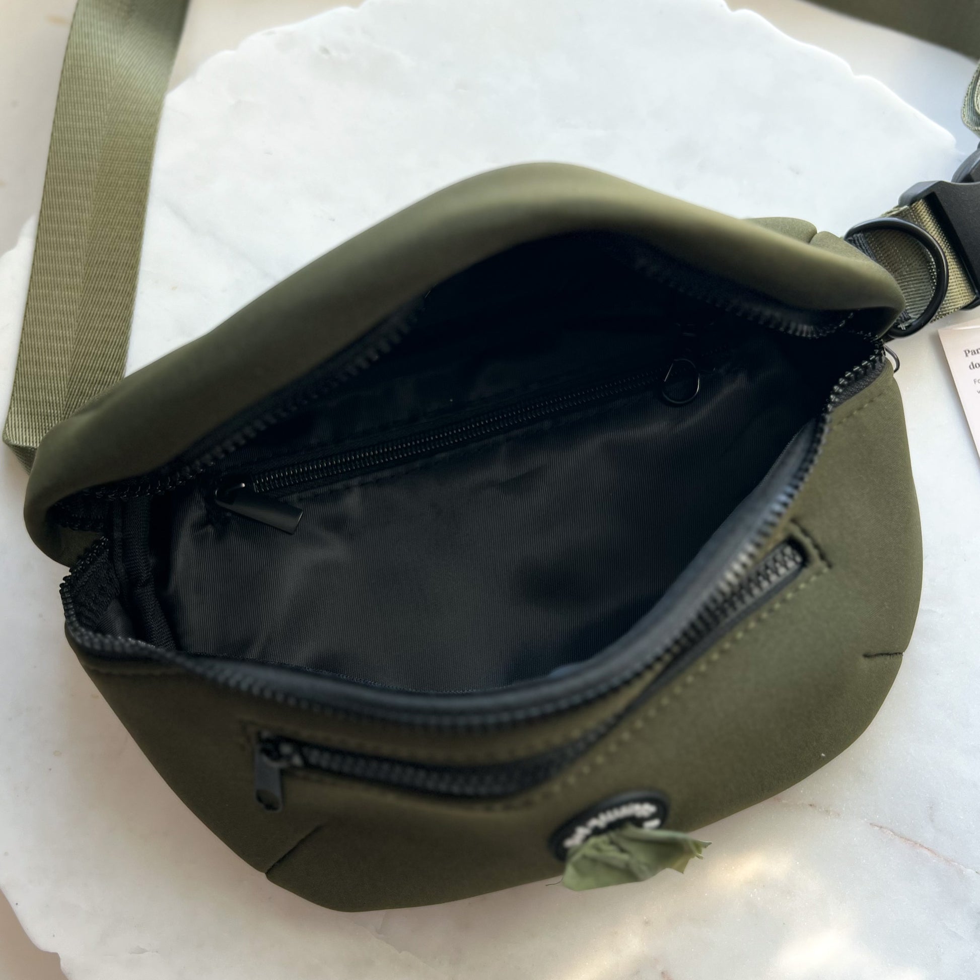 Strap includes a D-ring that can be used for a collapsible bowl, poop bag holder, or with a hands free leash. Front has a zippered compartment for poop bags (and treats). Inside has the main compartment, another zippered pocket, and a small clip. The inside will fit a regular sized water bottle.