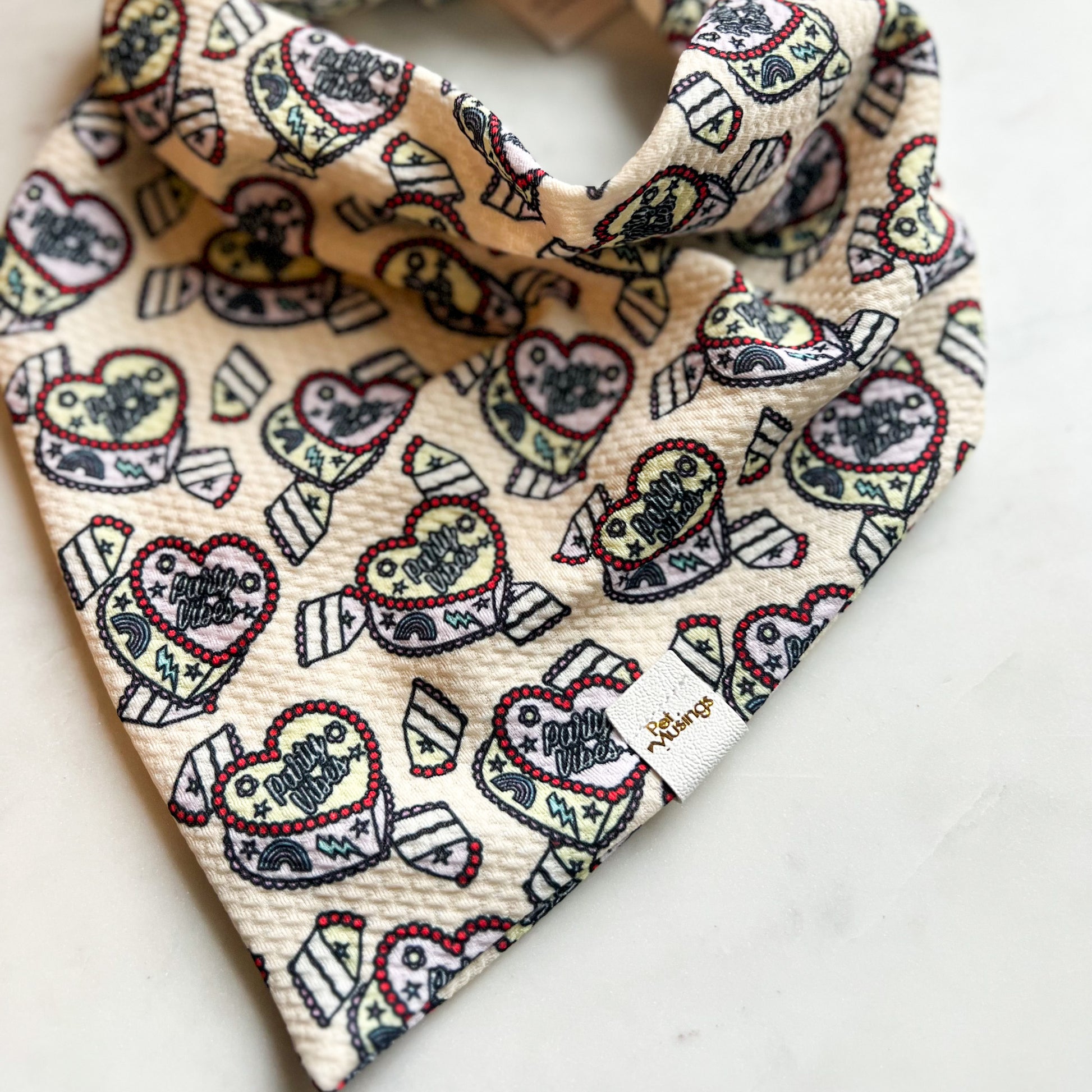 Machine wash cold and dry low heat. Be mindful not to leave your pets unattended with their bandana on.